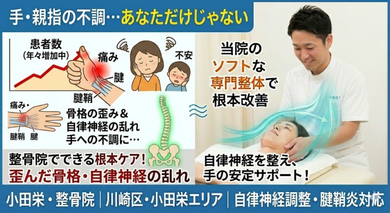 【川崎・小田栄】手首・親指の痛み…その正体は「腱鞘炎」?歴18年・延べ2万人の実績に基づく整体で根本改善へ