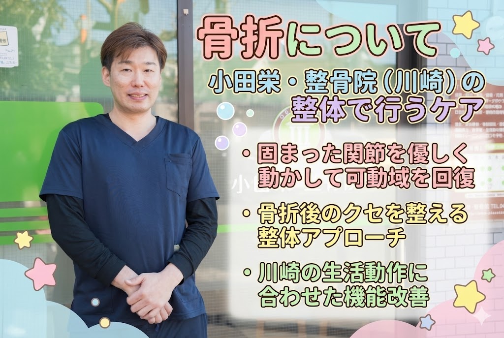 川崎で「骨折後に痛みが残る」「動きづらい」「早く回復したい」とお悩みの方は、整体と整骨院の両面からサポートする小田栄・整骨院にご相談ください。