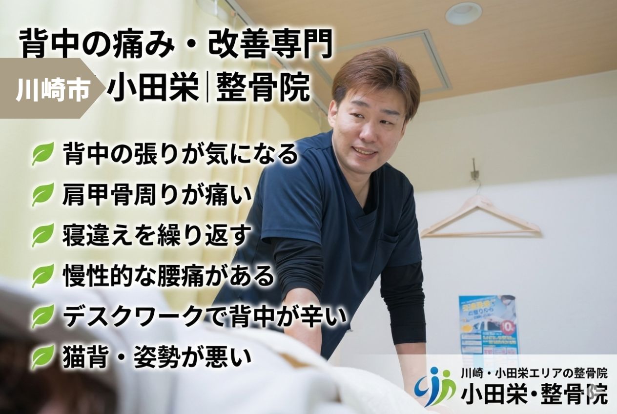 背中の痛みでお困り、お悩みの方は是非川崎市川崎区の小田栄整骨院までお越しください。