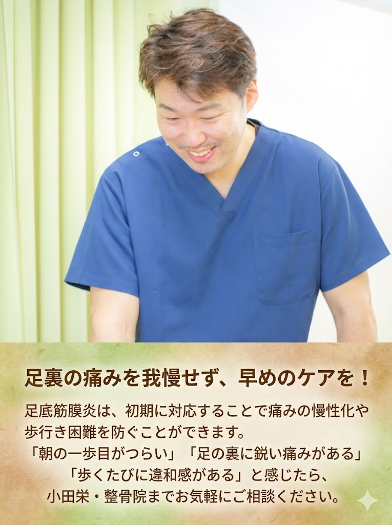 「朝の一歩目がつらい」「足の裏に鋭い痛みがある」「歩くたびに違和感がある」と感じたら、川崎市の小田栄・整骨院までお気軽にご相談ください。