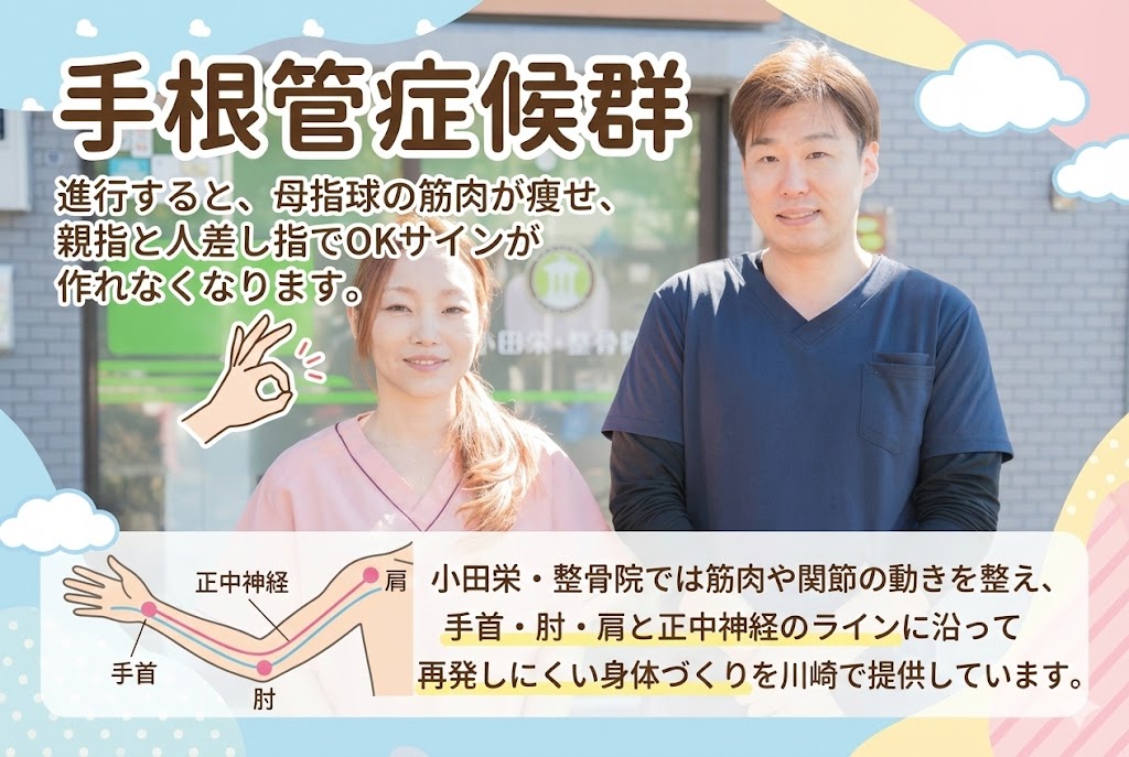 手根管症候群は進行すると、母指球の筋肉が痩せ、親指と人差し指でOKサインが作れなくなります。川崎で「ボタンがかけにくい」「小銭がつまめない」と感じて来院される方も多く、小田栄・整骨院の整体・整骨院施術が役立っています。整体で筋肉や関節の動きを整え、整骨院では手首・肘・肩と正中神経のラインに沿って再発しにくい身体づくりを川崎で提供しています。